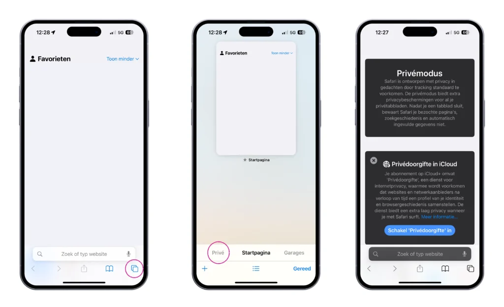 Je kunt een privévenster openen door in Safari op de Mac te gaan naar Archief > Nieuw privévenster. Wil je altijd privémodus gebruiken dan kun je dit aanpassen via Safari > Instellingen > Algemeen. Klik op het venstermenu ‘Open Safari met’ en kies ‘Een nieuw privévenster’. Op de iPhone en iPad tik je in Safari op het venster-icoon (twee vierkantjes over elkaar) en kies je linksonder voor Privé.